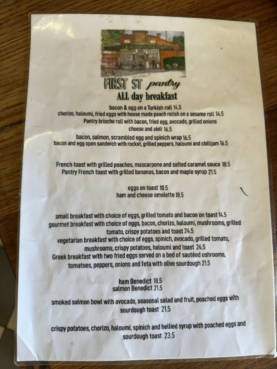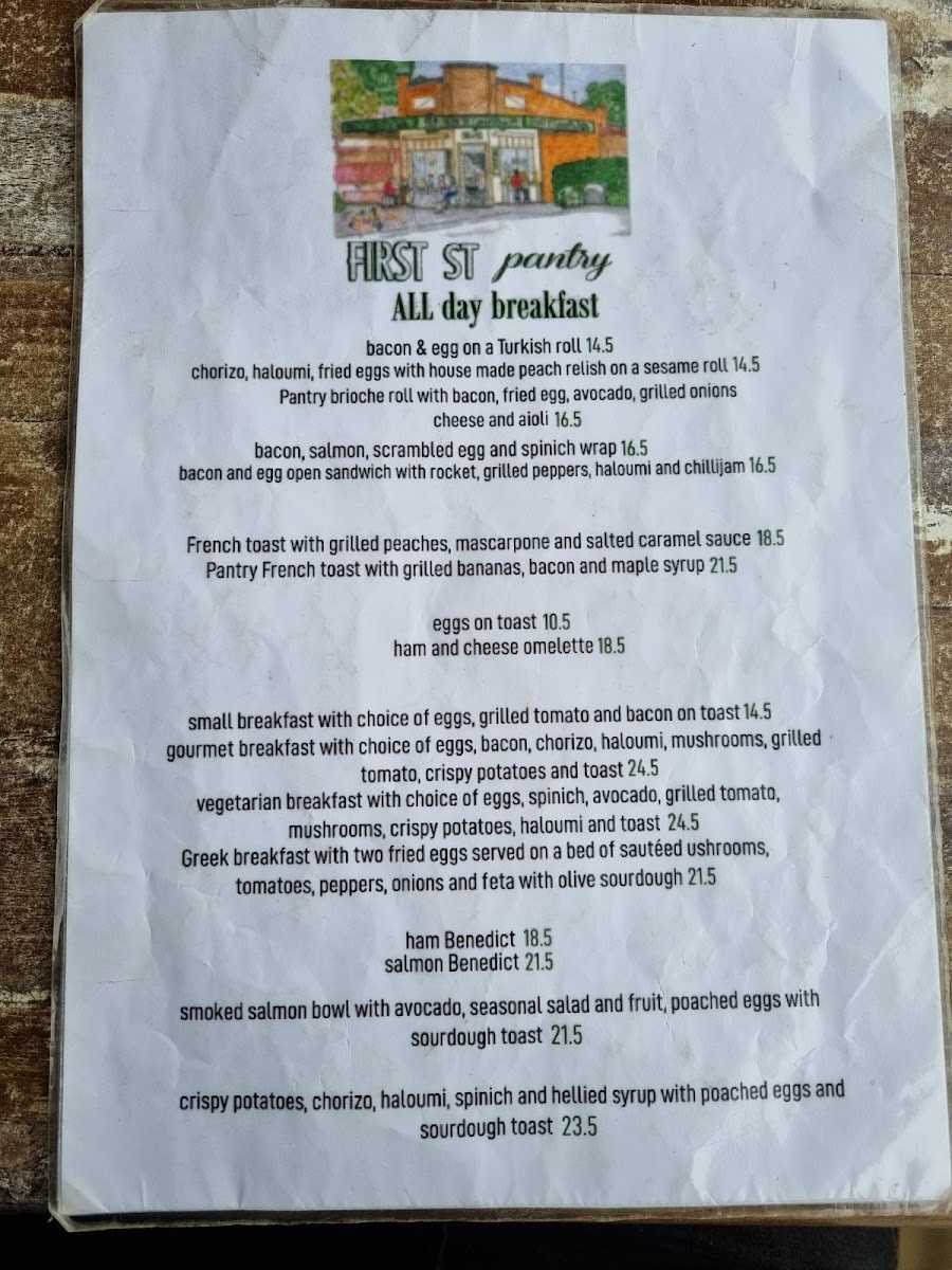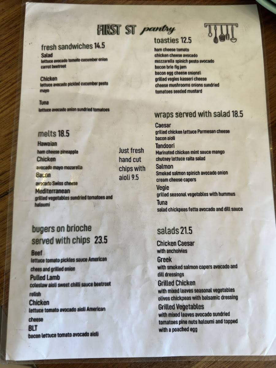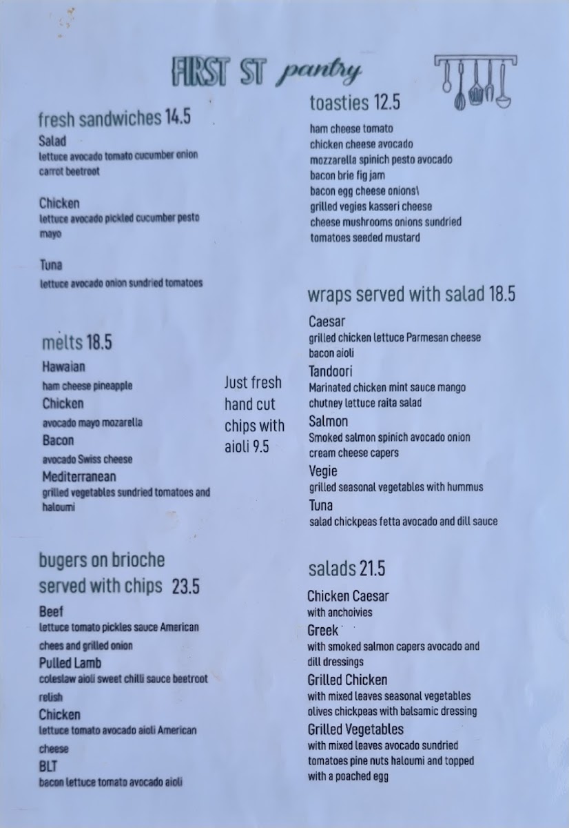 The menu at First Street Pantry offers a wide variety of options, ensuring there's something for everyone. Their fresh sandwiches, including the Salad, Chicken, and Tuna sandwiches, are perfect for a light meal. For those craving something heartier, the melts such as Hawaiian, Chicken, and Mediterranean provide a satisfying option. The burgers served on brioche with chips, such as the Beef, Pulled Lamb, and Chicken BLT, are particularly popular. For a quick and comforting meal, the toasties, like Bacon Brie Fig Jam and Bacon Egg Cheese Onions, offer a tasty, warm choice. The wraps, including Caesar, Tandoori, Salmon Vegie, and Tuna, are served with a refreshing salad on the side, making for a balanced meal. The salads, such as Chicken Caesar, Greek, and Grilled Chicken Grilled Vegetables, are a healthy, flavorful option. If you're looking for something a little more filling, the lunch bowls like Chicken, Smoked Salmon, and Falafel Grilled Vegetables are a great choice. For an all-day breakfast, the menu boasts a range of hearty options like the Bacon & Egg on a Turkish Roll, Chorizo, Haloumi, Fried Eggs with House Made Peach Relish on a Sesame Roll, and the Pantry Brioche Roll with Bacon, Fried Egg, Avocado, Grilled Onions, Cheese, and Aioli. The drinks menu includes Short Black, Cappuccino, Flat White, Latte, and Long Black for coffee lovers, along with a range of iced drinks like Iced Chocolate and Salted Caramel Iced Coffee. For tea enthusiasts, there are options like English Breakfast, Earl Grey, and Chai Tea. Additionally, the café offers Tandoori Chicken, Mushroom, and fresh Banana Bread and Coconut Bread for those wanting something extra to enjoy with their coffee.