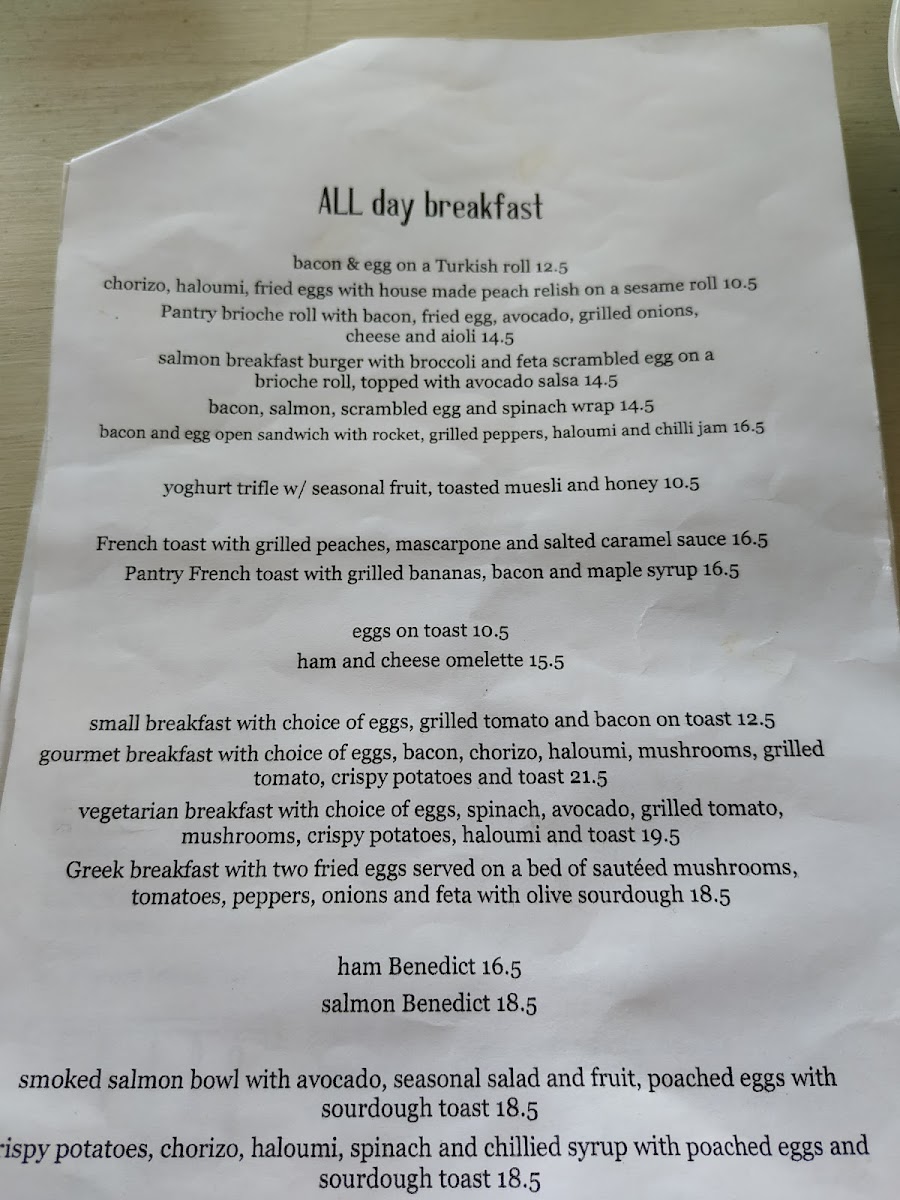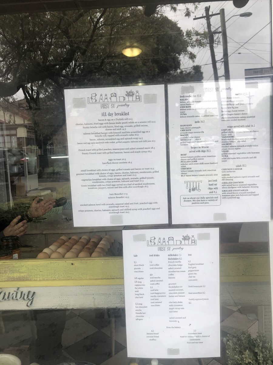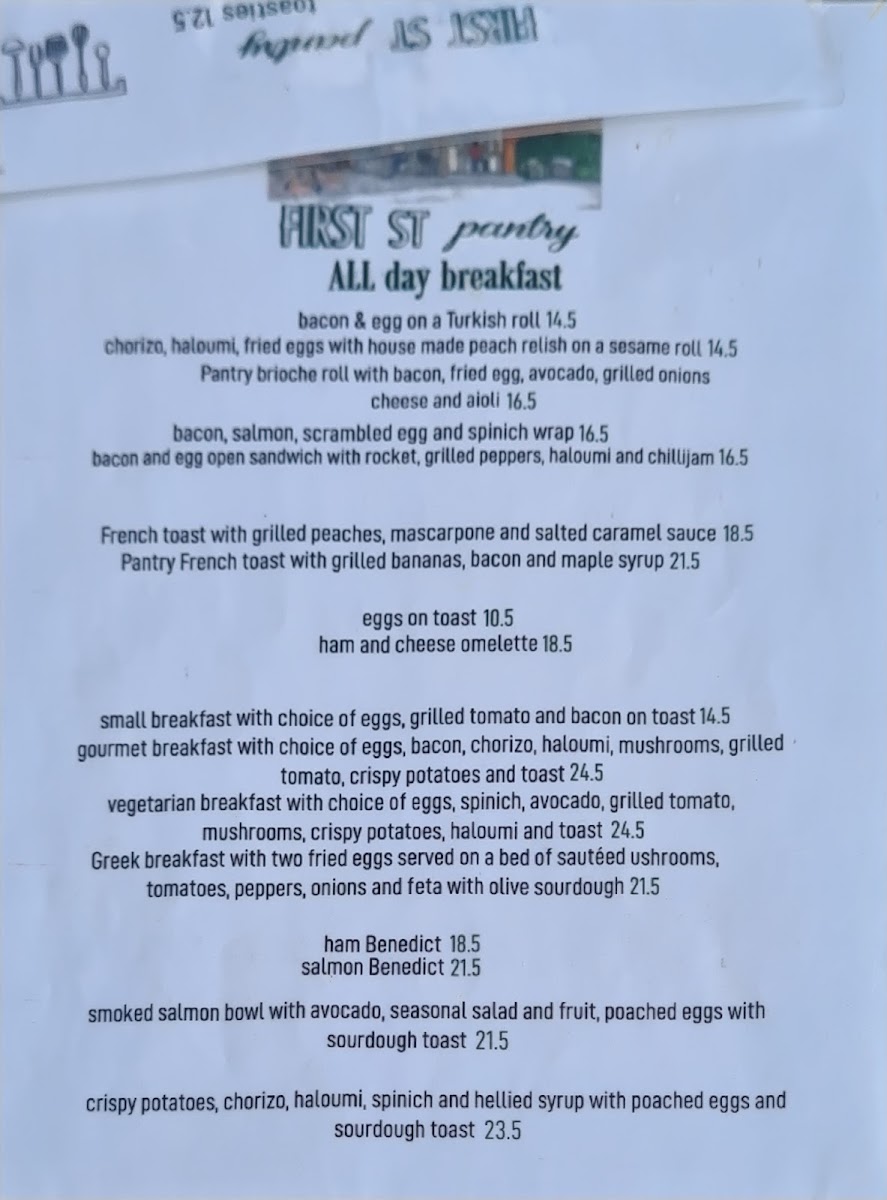 The menu at First Street Pantry offers a wide variety of options, ensuring there's something for everyone. Their fresh sandwiches, including the Salad, Chicken, and Tuna sandwiches, are perfect for a light meal. For those craving something heartier, the melts such as Hawaiian, Chicken, and Mediterranean provide a satisfying option. The burgers served on brioche with chips, such as the Beef, Pulled Lamb, and Chicken BLT, are particularly popular. For a quick and comforting meal, the toasties, like Bacon Brie Fig Jam and Bacon Egg Cheese Onions, offer a tasty, warm choice. The wraps, including Caesar, Tandoori, Salmon Vegie, and Tuna, are served with a refreshing salad on the side, making for a balanced meal. The salads, such as Chicken Caesar, Greek, and Grilled Chicken Grilled Vegetables, are a healthy, flavorful option. If you're looking for something a little more filling, the lunch bowls like Chicken, Smoked Salmon, and Falafel Grilled Vegetables are a great choice. For an all-day breakfast, the menu boasts a range of hearty options like the Bacon & Egg on a Turkish Roll, Chorizo, Haloumi, Fried Eggs with House Made Peach Relish on a Sesame Roll, and the Pantry Brioche Roll with Bacon, Fried Egg, Avocado, Grilled Onions, Cheese, and Aioli. The drinks menu includes Short Black, Cappuccino, Flat White, Latte, and Long Black for coffee lovers, along with a range of iced drinks like Iced Chocolate and Salted Caramel Iced Coffee. For tea enthusiasts, there are options like English Breakfast, Earl Grey, and Chai Tea. Additionally, the café offers Tandoori Chicken, Mushroom, and fresh Banana Bread and Coconut Bread for those wanting something extra to enjoy with their coffee.